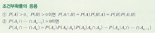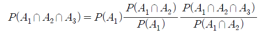 - 조건부확률 정의에 의하면 위식의 우변의 두 번째와 세 번째 분수 항은 각각 P(A2|A1)과 P(A3| A1 ∩ A2)으로 표시할 수 있으므로 아래와 같이 정리할 수 있다.