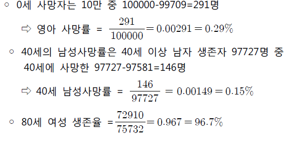 - 어느 해의 40대 사망률: 그해 40대 이상인 사람들 중에서 40대에 사망한 사람의 비율