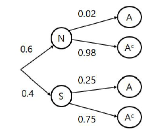 - 어떤 메일시스템의 수신메일 중 40$가 스팸메일(S)이고 나머지는 정상메일 (N)