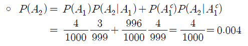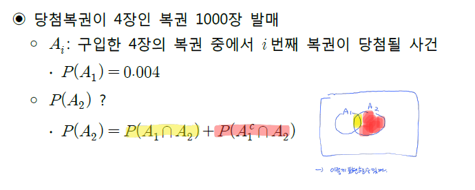 - 해당 예제에서 A2는 비복원 형태이기 때문에 A1이 당첨되고 A2가 당첨되는 경우와 A1이 당첨되지 않고 A2가 당첨되는 경우로 나올 수 있다. 따라서 위의 P(A2)로 표현가능하다.