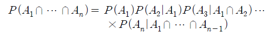 - 수학적 귀납법을 이용하면, 사건 A1....An에 대해 P(A1 ∩ ... ∩ A_n-1) > 0 일 때 아래와 같은 일반식을 유도할 수 있다.