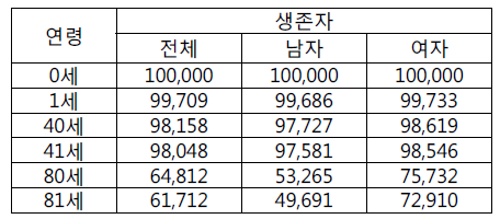 - 인구10만 명에서 시작하여 각 연령까지 생존한 사람의 수